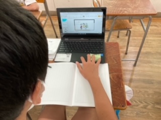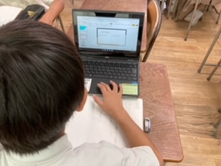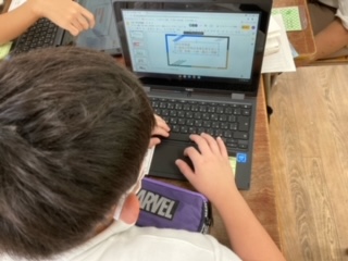高見小学校の未来について、班で話し合いながら、学習者用端末を使ってまとめています。