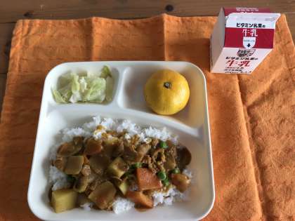 ポークカレーライス(米粉)、キャベツのピクルス、みかん、牛乳