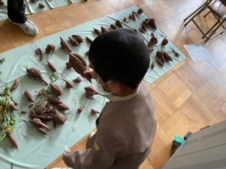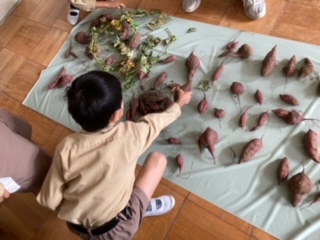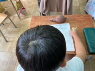 収穫した「さつまいも」の観察を行っていました。一人一人が、違う形や大きさのさつまいもを持ち、歓声を上げていました。