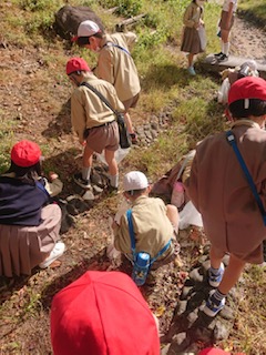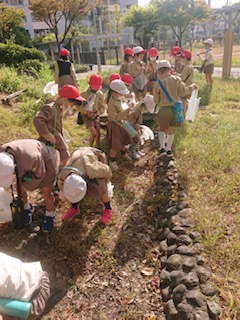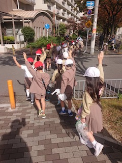 1年生は「公園たんけん」にでかけました。交通ルールを守り、公園まで歩いていきました。