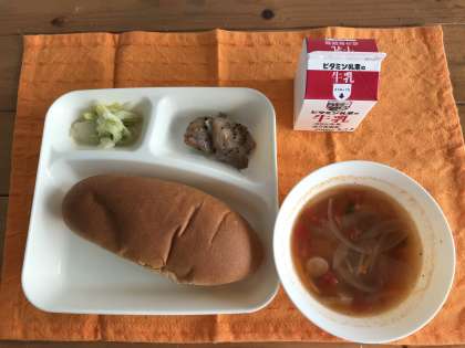 キャベツのガーリックソテー、黒糖パン、牛乳