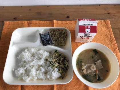 とりなっ葉いためは、「鶏のささみ」と「だいこんの葉」を使ったごはんによく合う献立です。だいこんの葉は、カロテンやビタミンCのほか、カルシウムや鉄などを多く含む緑黄色野菜です。(栄養教諭)