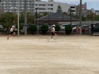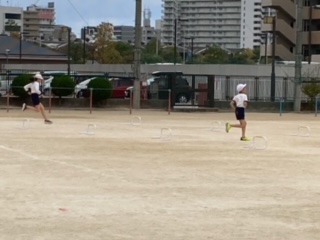 4年2組の体育の様子です。小型ハードル走を行い、タイムをとっていました。