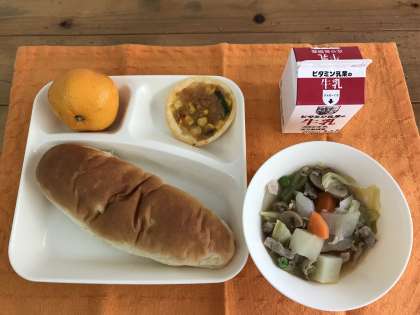豚肉と野菜のスープ煮、変わりピザ、みかん、おさつパン、牛乳