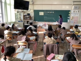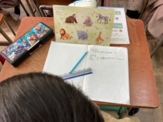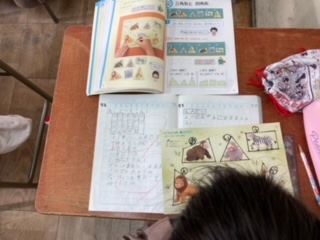 三角形と四角形の学習です。「ちょく線の数を見てなかま分けをしよう。」に取り組んでいます。