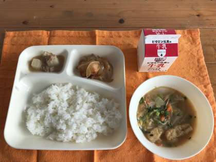 鶏肉の甘辛やき、みそ汁、だいこんの煮もの、ごはん、牛乳