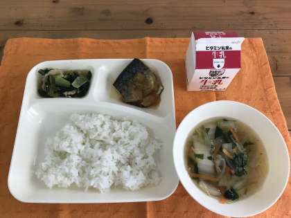 さばのみぞれかけ、すまし汁、こまつなの煮びたし、ごはん、牛乳