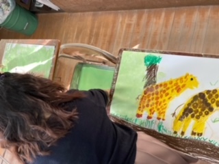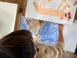 先日描いた動物の絵の背景に、色を付けています。もうすぐ完成します。