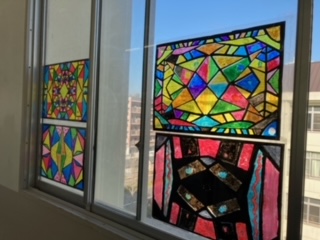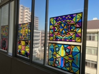 図画工作で取り組んでいた「ステンドグラス」ですが、完成したものを廊下の窓に掲示しています。とても奇麗です。