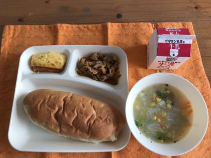 豚肉のケチャップソテー、コーンスープ、焼きプリン、おさつパン、牛乳