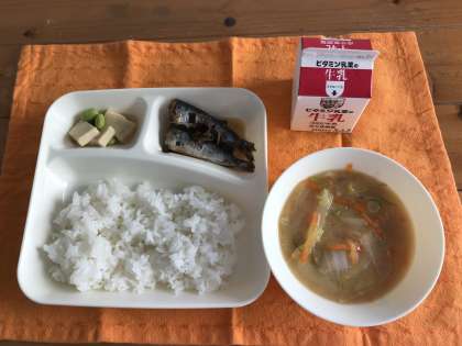いわしのしょうが煮、みそ汁、高野どうふの煮もの、ごはん、牛乳