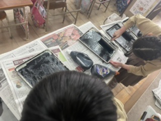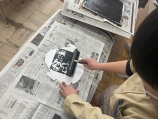 図工科の紙版画では、いよいよ紙に刷りました。手を何度も真っ黒にしながら上手く紙にうつったときは、「わぁ!」と声が出ました。