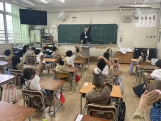 生活科の「がっこうにいるひととなかよくなろう」の学習で、教頭先生の特別授業がありました。みんな、興味津々でたくさん質問の手が挙がりました。