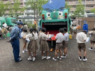 「パッカー車体験」では、環境事業センターの方のお話をしっかり聞いて、社会科の学習を進めていました。たくさんの質問にもしっかり答えていました。
