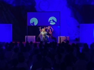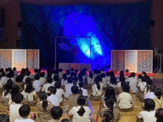 午前中の前半は低学年、後半は高学年が、劇団かかし座による「ふしぎの国のアリス」を鑑賞しました。影絵や芝居、歌があり、とても楽しい作品でした。
