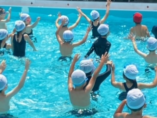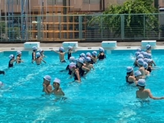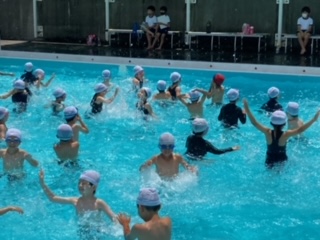 トトロの曲に合わせて体を動かしました。楽しく、水遊びをしています。