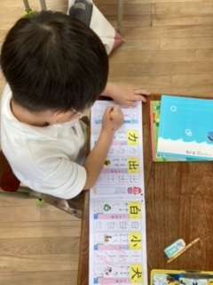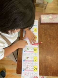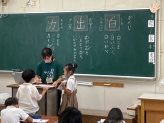 漢字の練習です。きれいに書いた字を見てもらっています。