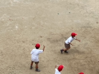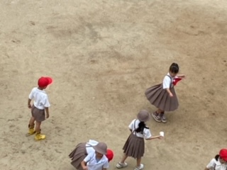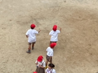 雨が止んでいる間に、運動場に出て、シャボン玉を作って遊びました。