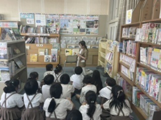 高見小学校では、毎週火曜日、図書館に学校司書の先生が来ます。1年生は、図書の時間が大好きです。今日は、担任の先生が読み聞かせをしていました。