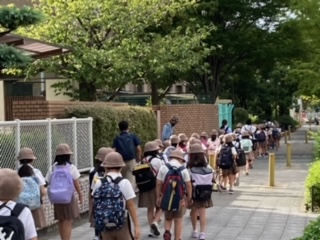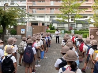 今日の社会見学は、JR環状線の電車や阿倍野ハルカスから見える「大阪の町の様子」を調べる活動です。今、出発しました。
