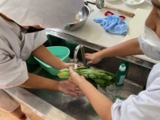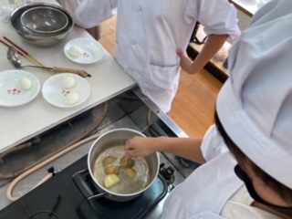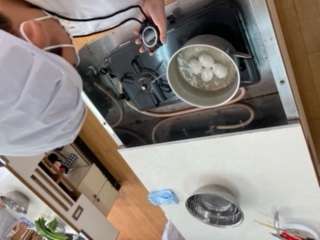 家庭科の調理実習、材料は、卵、じゃがいも、ほうれん草です。今日は「ゆでる」学習をしました。