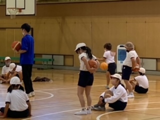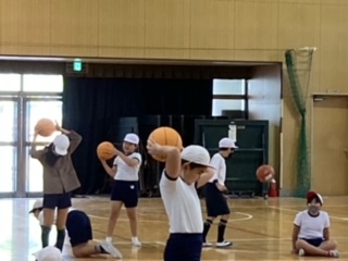 体育で、バスケットボールを始めました。ボールに慣れる練習です。