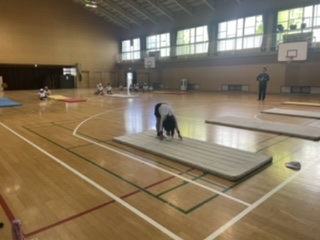体育科の「マット運動」では、開脚後転と伸膝後転(しんしつこうてん)の練習をしていました。