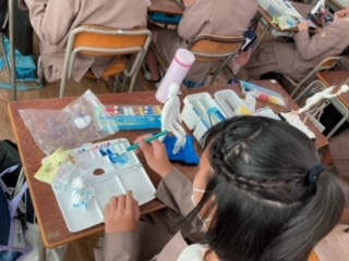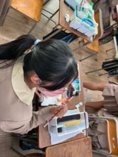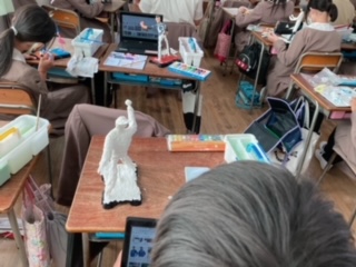 図画工作では、芯材に粘土をつけ、人の動きを表現する作品を作っています。できあがりが楽しみですね。