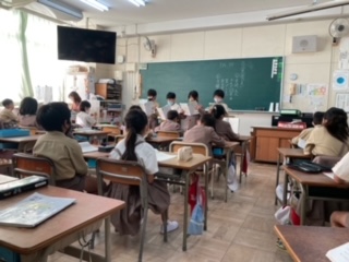 前に出て、音読を発表しています。
