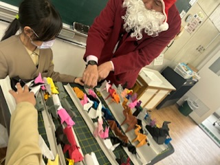 1年生の教室に教頭先生が来て「どうぶつおりがみ」をプレゼントしてくれました。ぞう、かば、さい、フラミンゴ、しか、しろくま…遠足で行った天王寺動物園にいた動物がたくさんありました。くじで引かれた順に好きな「どうぶつおりがみ」を選んでいました。
