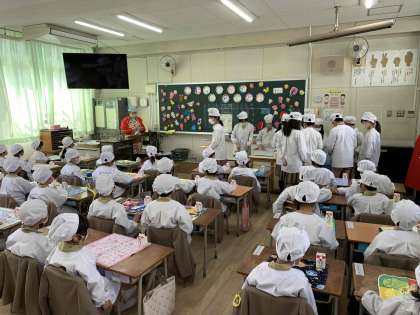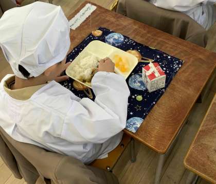 1年生は初めての給食で、手洗い、エプロン・マスクの着用、ナフキンの準備等たくさんのことを一度に練習しました。
