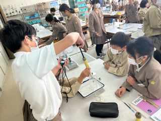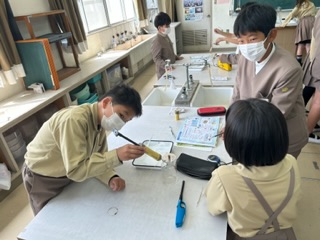 理科の「ものが燃えるときの空気の変化」の学習では、気体検知管を使って、ものが燃える前と後の空気の変化を調べました。初めて使う器具もあり、みんな慎重に実験を進めていました。