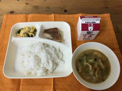あかうおのしょうゆだれかけ、みそ汁、えんどうの卵とじ、ごはん、牛乳