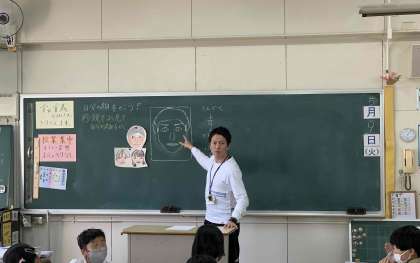 どんなふうに描くか、先生が見本を見せながら説明する様子をみて、子どもたちは