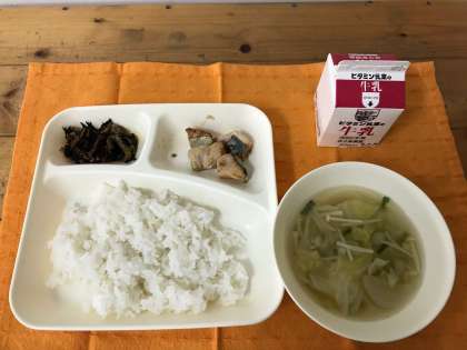 さけのごまみそ焼き、五目汁、ひじきのいため煮、ごはん、牛乳