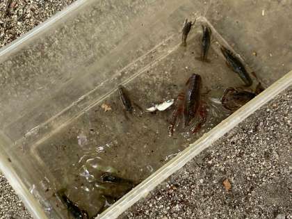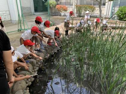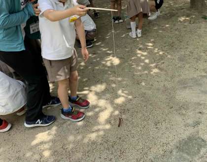 割りばしとタコ糸で作った釣り竿で、釣りを楽しみました。