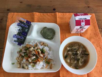 小学校の給食室では、具材と米を一緒に炊くことができません。そのため、かやくご飯は、具材を調理したものを食べる時にお皿の中でご飯と混ぜています。混ぜ具合で味が変わるのも、給食のかやくご飯の特徴です。(栄養教諭)