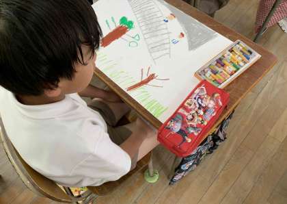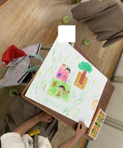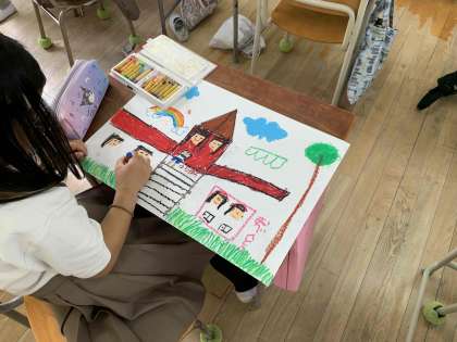 遊具で遊んだこと、お弁当を食べたこと、思い思いの場面をパスで画用紙いっぱいに描きました。