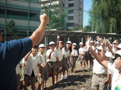 ジャンケンで、土をかける人を選びました。みんなの気持ちを込めて植えたジャガイモ。どうか立派なジャガイモができますように。