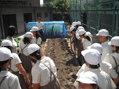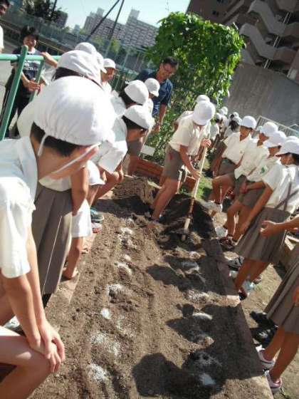 バトンを使って等間隔に種イモを置きました。土の中に埋めた後、上に肥料をまきました。その上に土をかぶせ、水をあげたら終わりです。