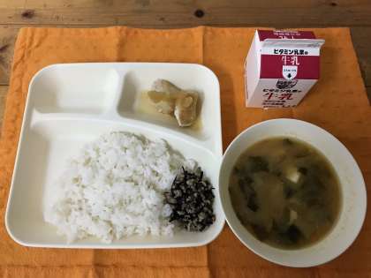 鶏肉のおろしじょうゆかけ、みそ汁、魚ひじきそぼろ、ごはん、牛乳