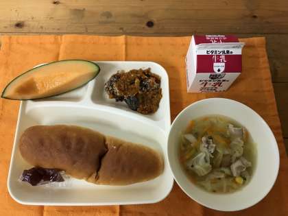 メロンは、年に1度しか出ない果物です。今年は、果肉が赤いクインシーメロンでした。子どもたちは、給食を運ぶ時から「メロンのいい香りがする。」と喜んでいました。スプーンですくいやすい柔らかさで、甘さもしっかりありました。生の果物は、成熟が天候によって左右されるので、メロンを給食で食べられない年もあります。今年は、みんなでおいしいメロンが食べられたことをうれしく思っています。(栄養教諭)