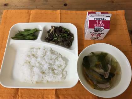 牛肉とピーマンやたけのこなどをいため、さとうやしょうゆ、オイスターソースなどで味付けしています。(栄養教諭)