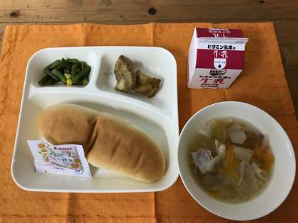 鶏肉にワイン、塩、こしょう、ガーリック(粉末)、カレー粉、油をまぶしてから、焼きました。カレー味にすると、あまり食欲がない時でも食べやすくなります。これから、だんだん暑くなりますので、ぜひ試してください。(栄養教諭)