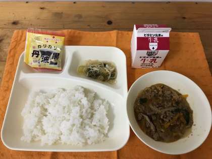 マーボーはるさめは、豆板醤、砂糖、料理酒、塩、こい口しょうゆ、赤みそで味付けしました。豆板醤は、1,2年生でも辛く感じない程度の量を入れています。辛みがコクとして感じられるので、大人が食べてもおいしかったです。(栄養教諭)