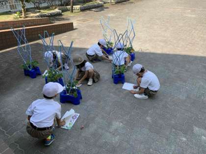 1年生が育てているあさがおが、ずいぶん大きくなりました。