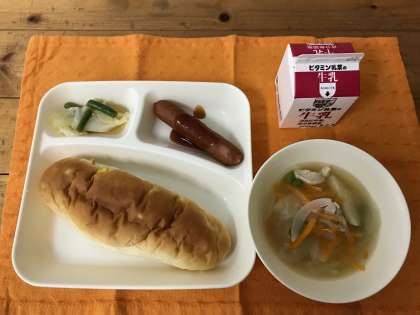 今日は、サイコロ形に切ったさつまいもとさつまいものペーストが入ったおさつパンでした。さつまいものペーストが入っているので、コッペパンに比べると味は少し甘く、食感は柔らかく焼きあがります。給食でおさつパンが出るのを楽しみにしている児童がいます。(栄養教諭)