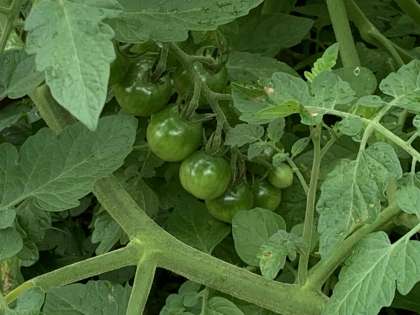 また、トマトもすずなりです。まだ、緑色ですが、もう間もなく赤いトマトになりますよ。