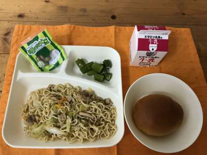 和風焼きそば、オクラの甘酢あえ、まっ茶大豆、黒糖パン(小)、牛乳