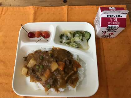 ハヤシライス、ミックス海そうのサラダ、さくらんぼ、牛乳